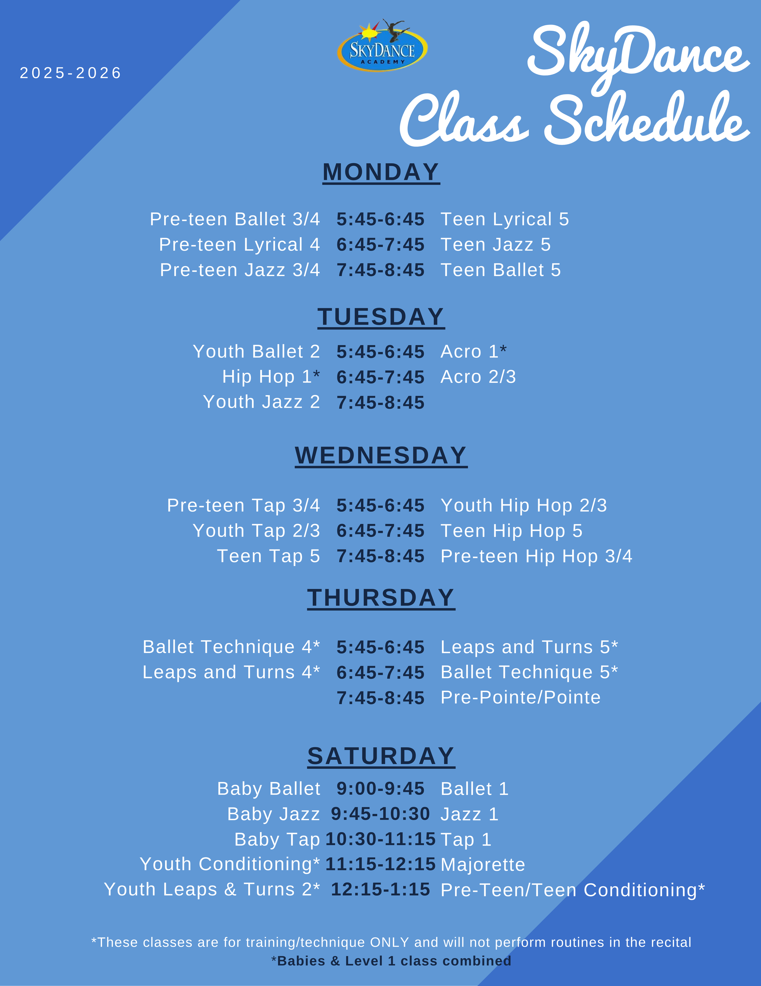 SkyDance Academy prides itself on fostering the growth of each student through personalized training. We place dancers in groups based on an individual student’s age, ability, potential, length of study and experience. The student’s attitude, interests and goals will also be taken into consideration.